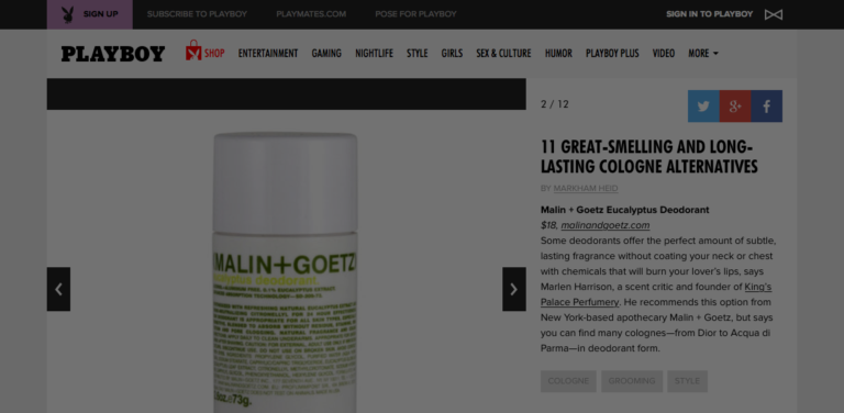 “Some deodorants offer the perfect amount of subtle, lasting fragrance without coating your neck or chest with chemicals that will burn your lover’s lips, says Marlen Harrison, a scent critic and founder of King’s Palace Perfumery. He recommends this option from New York-based apothecary Malin + Goetz, but says you can find many colognes—from Dior to Acqua di Parma—in deodorant form.”